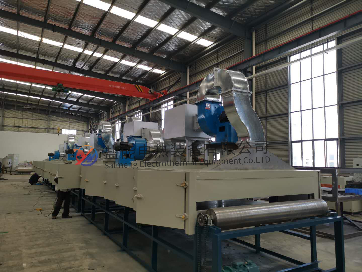烘道主要由炉体、电加热管、热风搅拌电机、网带式输送系统和电气控制系统等组成。炉体主要由型材组成框架,外板与炉膛之间内填优质硅酸铝棉进行隔热保温。顶部设有排汽口,适时启闭调节阀可自然排放出烘道内产生的废气。为确保设备平衡度,在每个底脚上都装有调节脚。加热元件采用多支电加热管均匀排列安装于炉内网带上下两侧,对网带上工件进行直接加热供干、升温快、热效果好。搅拌风机安装在房体顶部,对房体内的热空气进行搅拌,进一步提高了工件受热均匀性。输送系统主要由链轮、网带、涨紧器及驱动电机组成,直接安装固定在骨架上。网带传输通过式进出炉膛,采用变频调速电机控制网带输送谏度。在网带的两侧采用角钢轨道对网带进行支承,同时传输系统上配置手动涨紧器,可确保网带输送时的稳定性据工件加热烘干工艺要求,烘干段分8区控温,每加热区可独立控制。采用温度传感器、智能式数显温控仪表、可控硅等组成温度控制电路,进行PID自整定、自动恒温控制,可      控制毎区加热温度。具有断偶、漏电保护的功能,当设备出现超温状况时声光报警并自动停止加热。